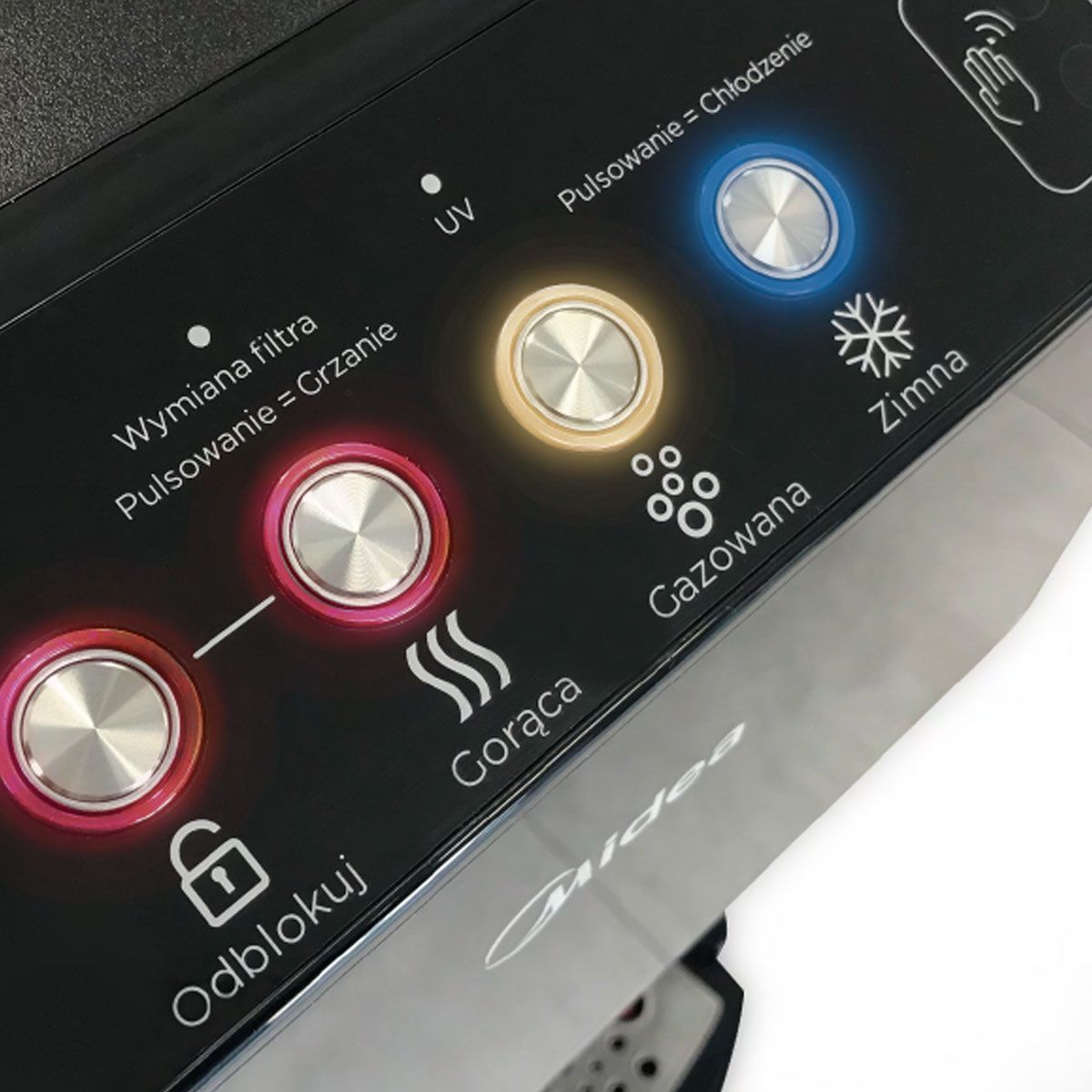 Sterowanie odbywa się za pomocą przycisków z podświetleniem LED. Dzięki temu użytkownik otrzymuje dodatkowe informacje o pobieraniu wody oraz statusie dystrybutora. Sensor zbliżeniowy pozwala na pobór wody zimnej bez dotykania urządzenia.